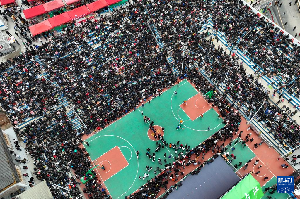 这是2024年3月22日拍摄的2024年乡村篮球球王争霸赛开幕式现场(无人机照片)。当日,以“活力四射 迎‘篮’而上”为主题的2024年乡村篮球球王争霸赛开幕式在贵州省黔东南苗族侗族自治州台江县台盘村举行。本次比赛将从3月持续到11月,是一次跨度长、范围广的全新赛事。新华社记者 杨文斌 摄
