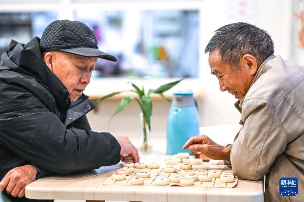 两位老人在贵阳市南明区红岩东郡社区诚善助老公益互助服务点下棋(10月24日摄)。